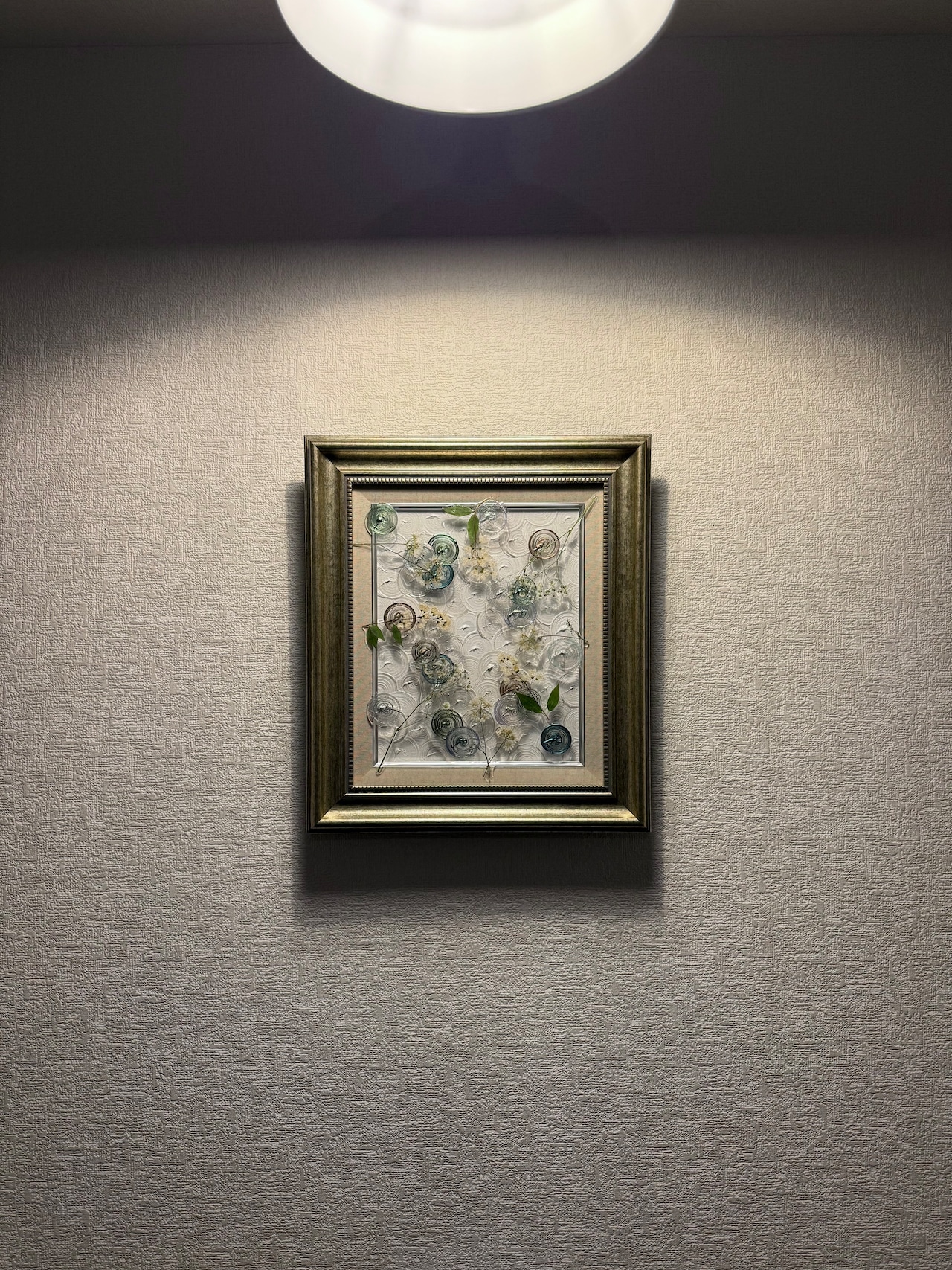 ・額縁にはレジン(樹脂)を使用しています。黄変しにくい高品質なものを選んでいますが、経年や環境によっては、わずかに色味が変化する可能性があります。