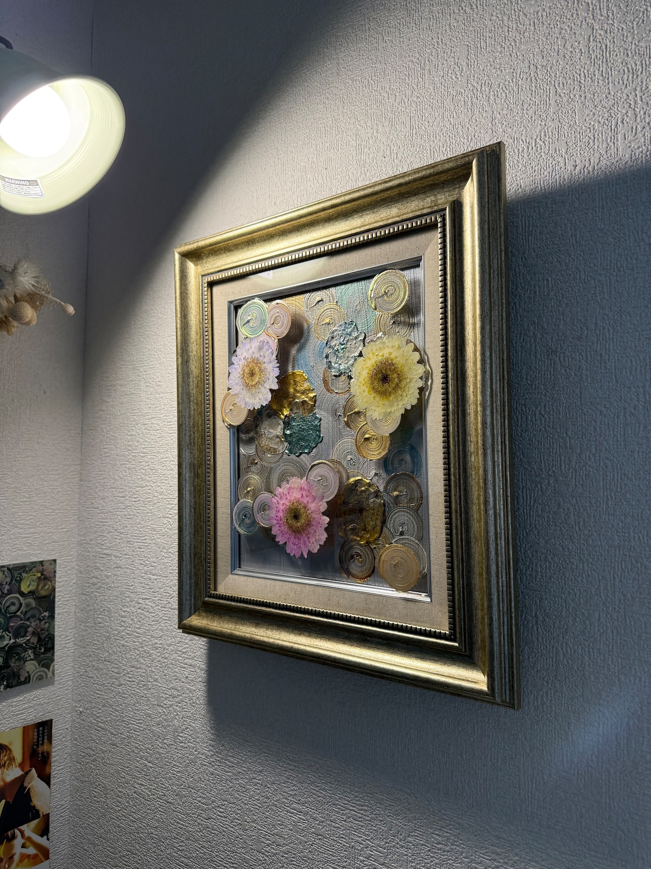 キャンバス原画と、押し花と渦を施した額縁。